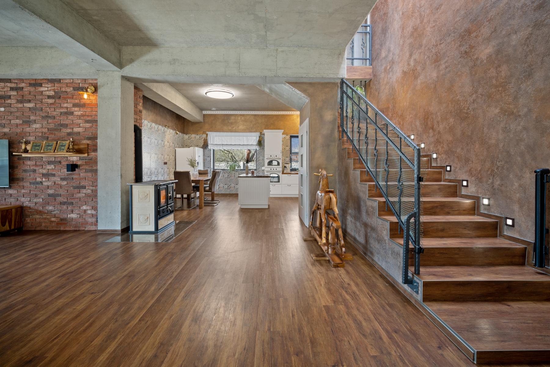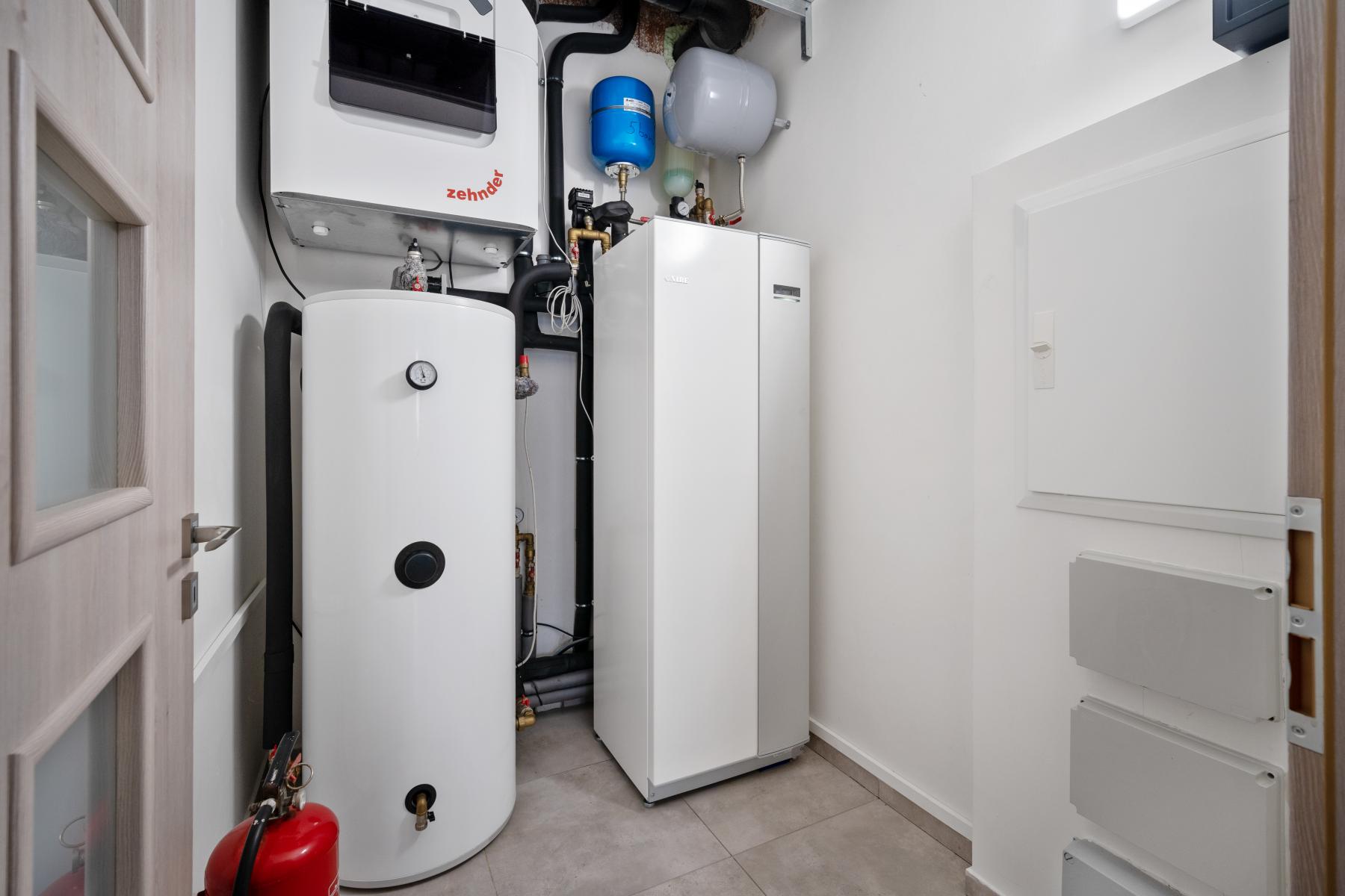 Tento luxusní rodinný dům byl postavený z kvalitních cihel a betonu, který je vkusně přiznaný. Nemovitost je vybavena technologií Chytrý dům, díky které můžete všechny systémy domu ovládat pohodlně ze svého telefonu, případně dále rekuperací. Dům je vytápěný tepelným čerpadlem společně s krbovými kamny a tepelnými vrty o hloubce až 80 metrů. V celém domě naleznete moderní podlahové topení a chlazení. Rodinný dům disponuje dalšími dvěma garážemi, které se v současnosti využívají pro uskladnění zahradní a sezónní techniky.