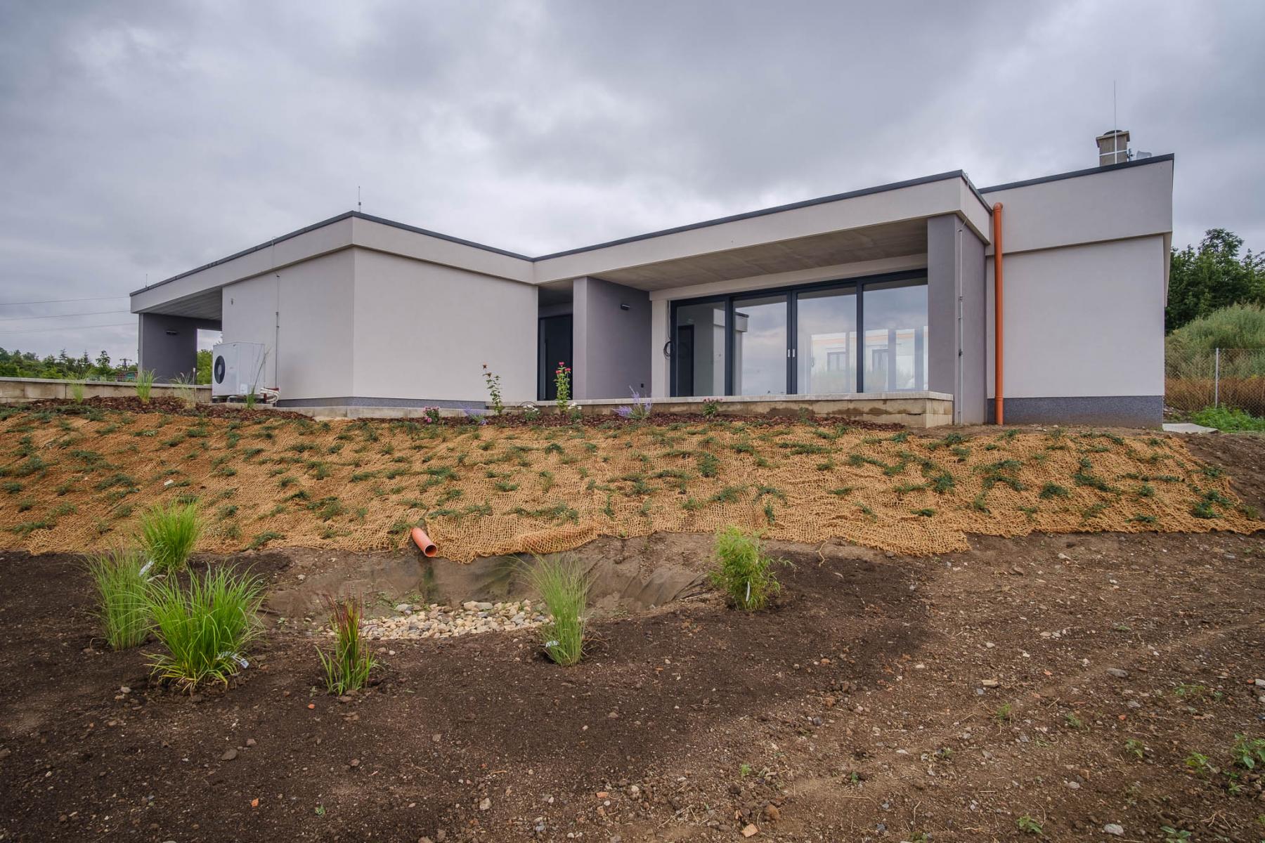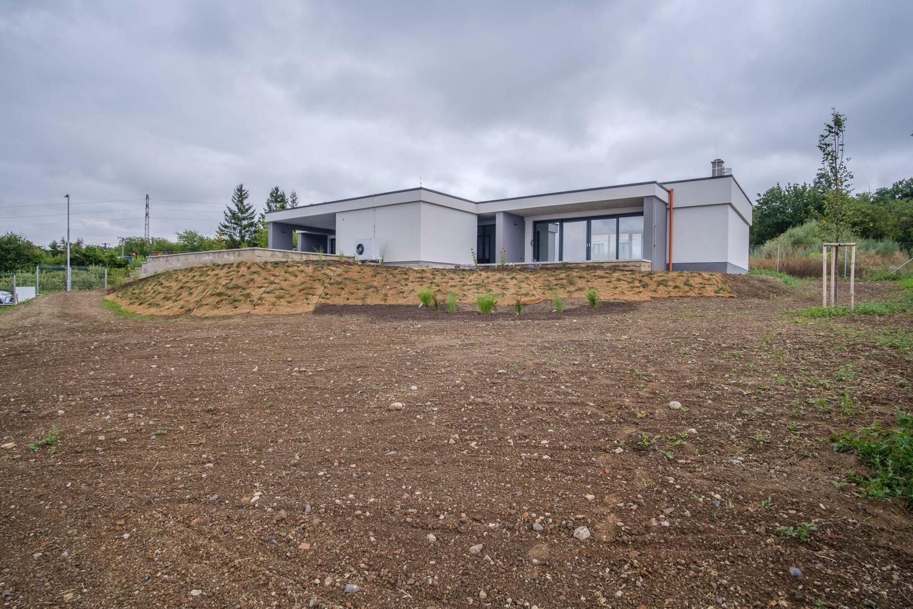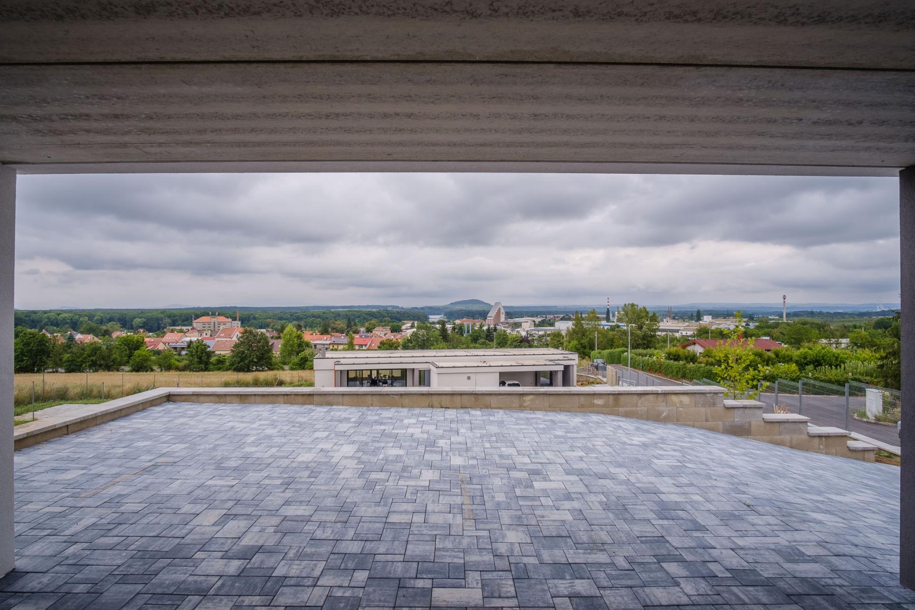 K domu se dostanete po veřejné komunikaci. Dům se nachází na nově vznikající obytné lokalitě a z pozemku máte vynikající panoramatický výhled do Českého středohoří. U domu najdete zastřešené parkovací stání pro dva vozy, bez problému jich zde ale zaparkujete vícero. Při vstupu do objektu si všimnete dlouhé chodby vedoucí do obývacího pokoje. Po cestě chodbou minete několik samostatných pokojů, ložnici, technickou místnost a celkem dvě vyhotovené koupelny. Následuje velký a prostorný obývací pokoj, kde zároveň najdete i vestavěný krb na tuhá paliva.