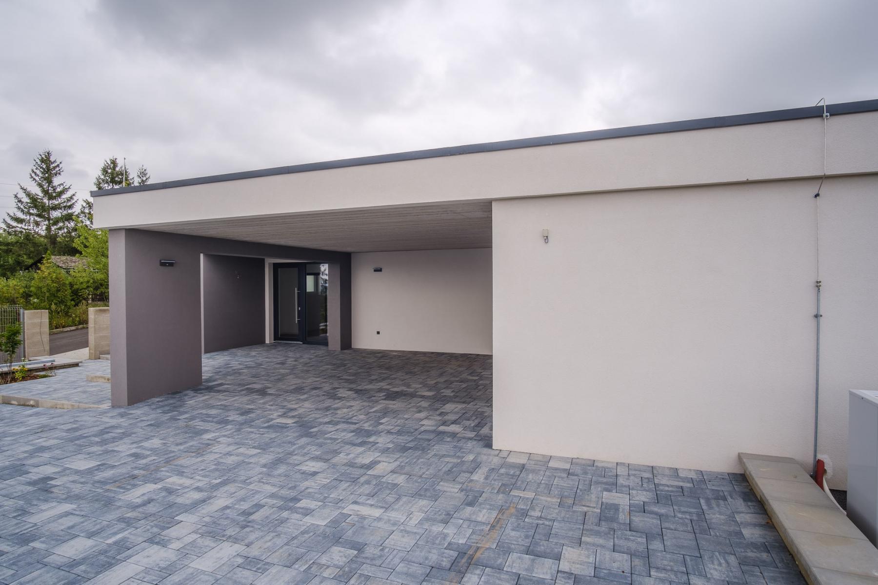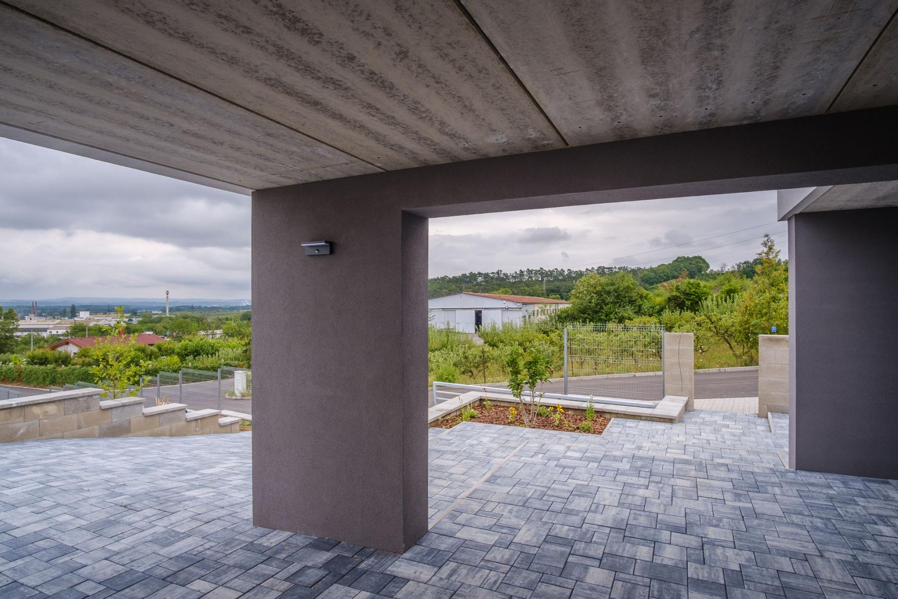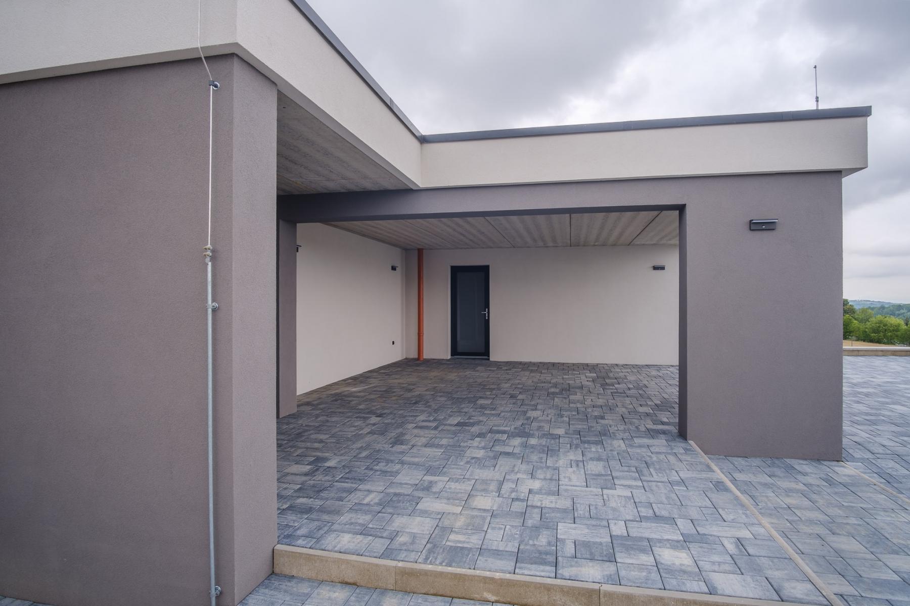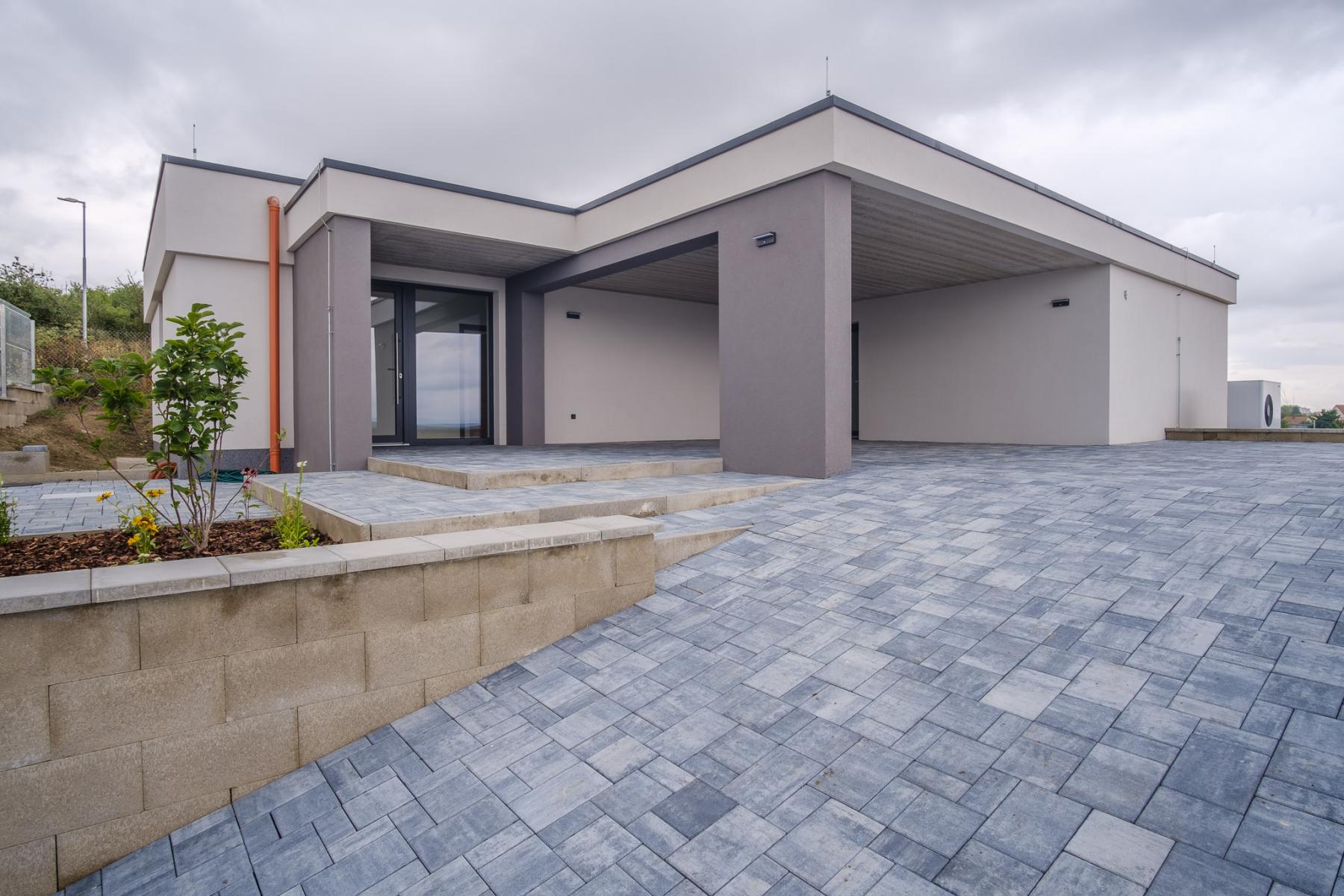 K domu se dostanete po veřejné komunikaci. Dům se nachází na nově vznikající obytné lokalitě a z pozemku máte vynikající panoramatický výhled do Českého středohoří. U domu najdete zastřešené parkovací stání pro dva vozy, bez problému jich zde ale zaparkujete vícero. Při vstupu do objektu si všimnete dlouhé chodby vedoucí do obývacího pokoje. Po cestě chodbou minete několik samostatných pokojů, ložnici, technickou místnost a celkem dvě vyhotovené koupelny. Následuje velký a prostorný obývací pokoj, kde zároveň najdete i vestavěný krb na tuhá paliva.