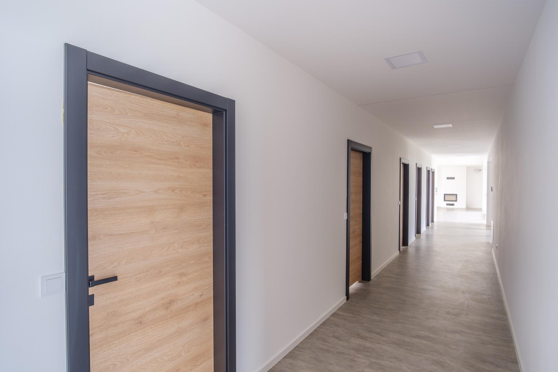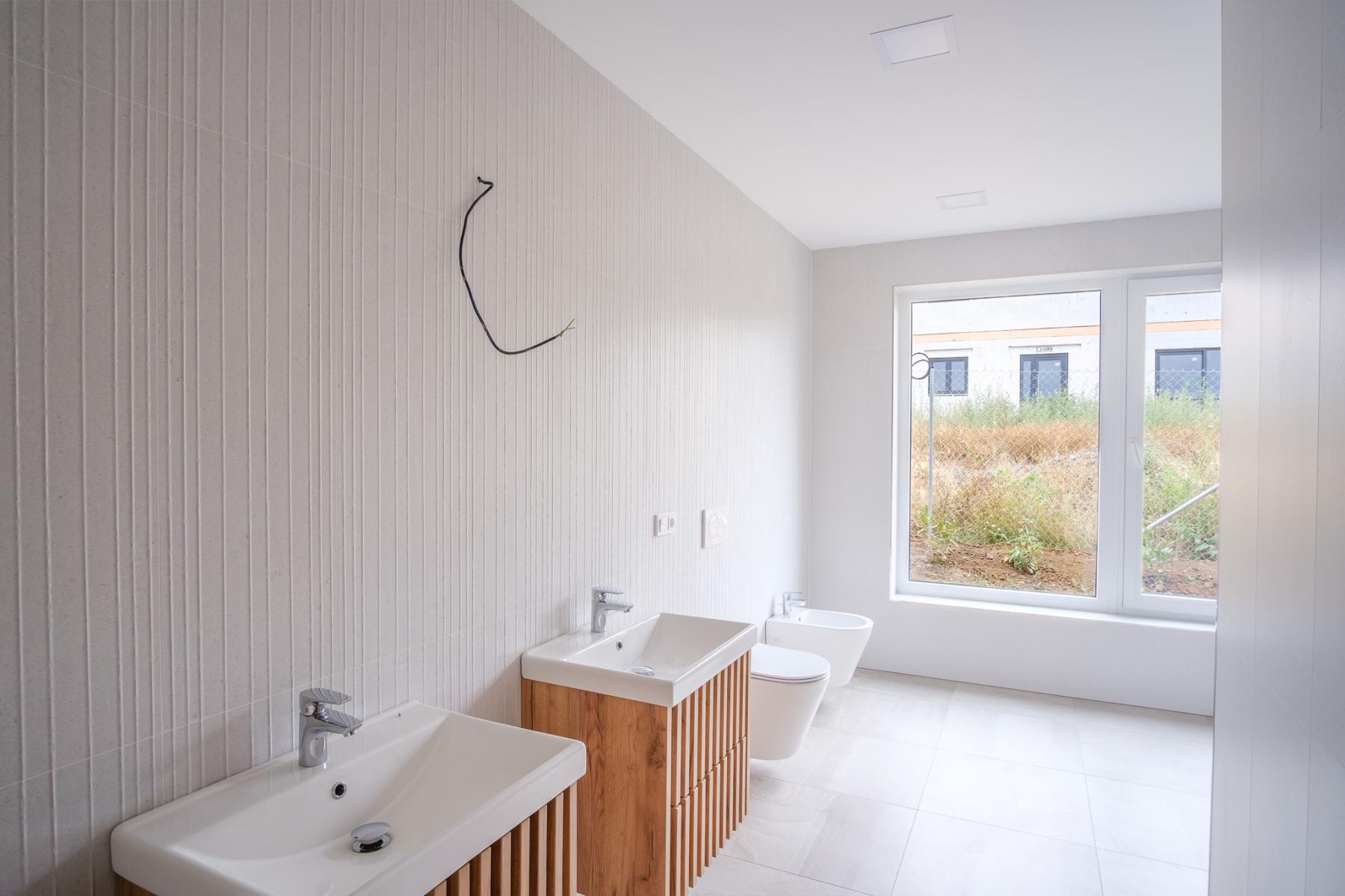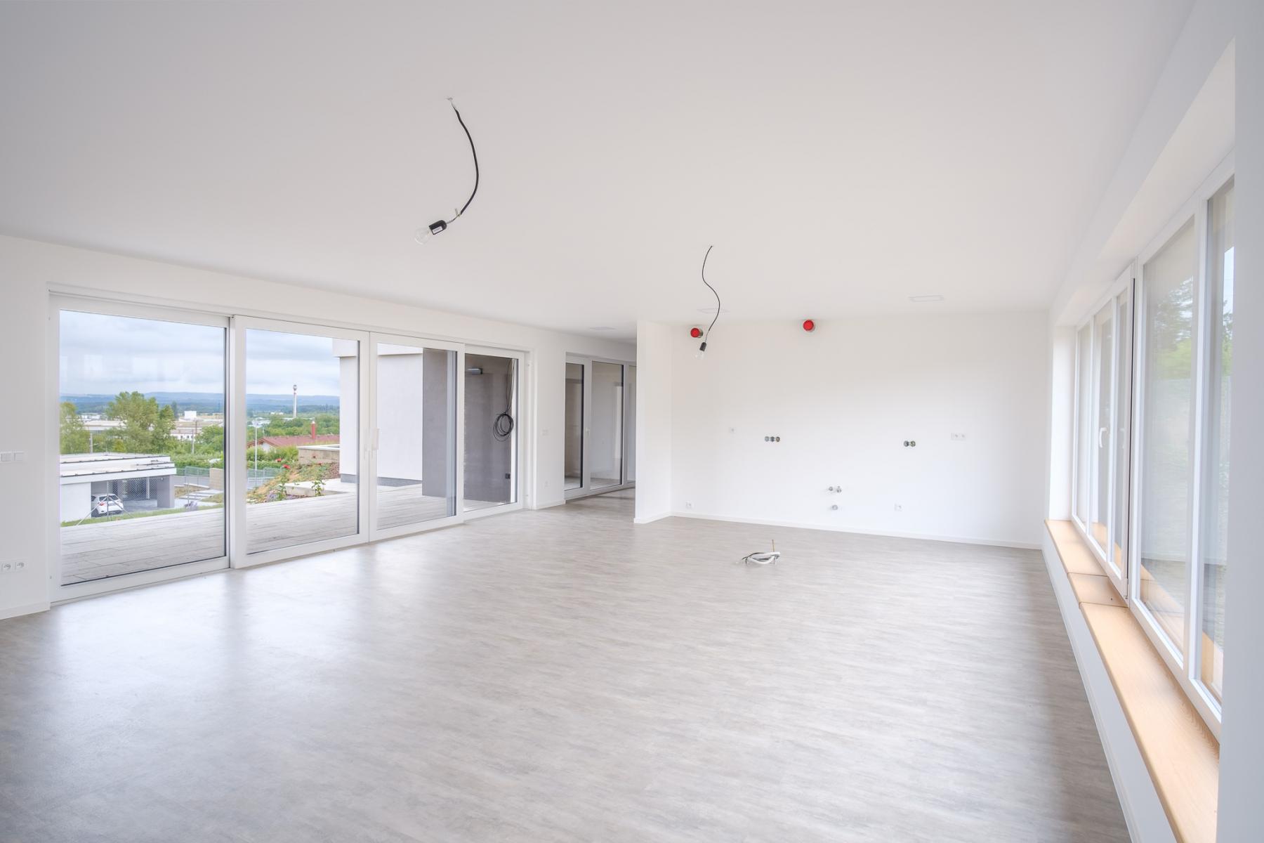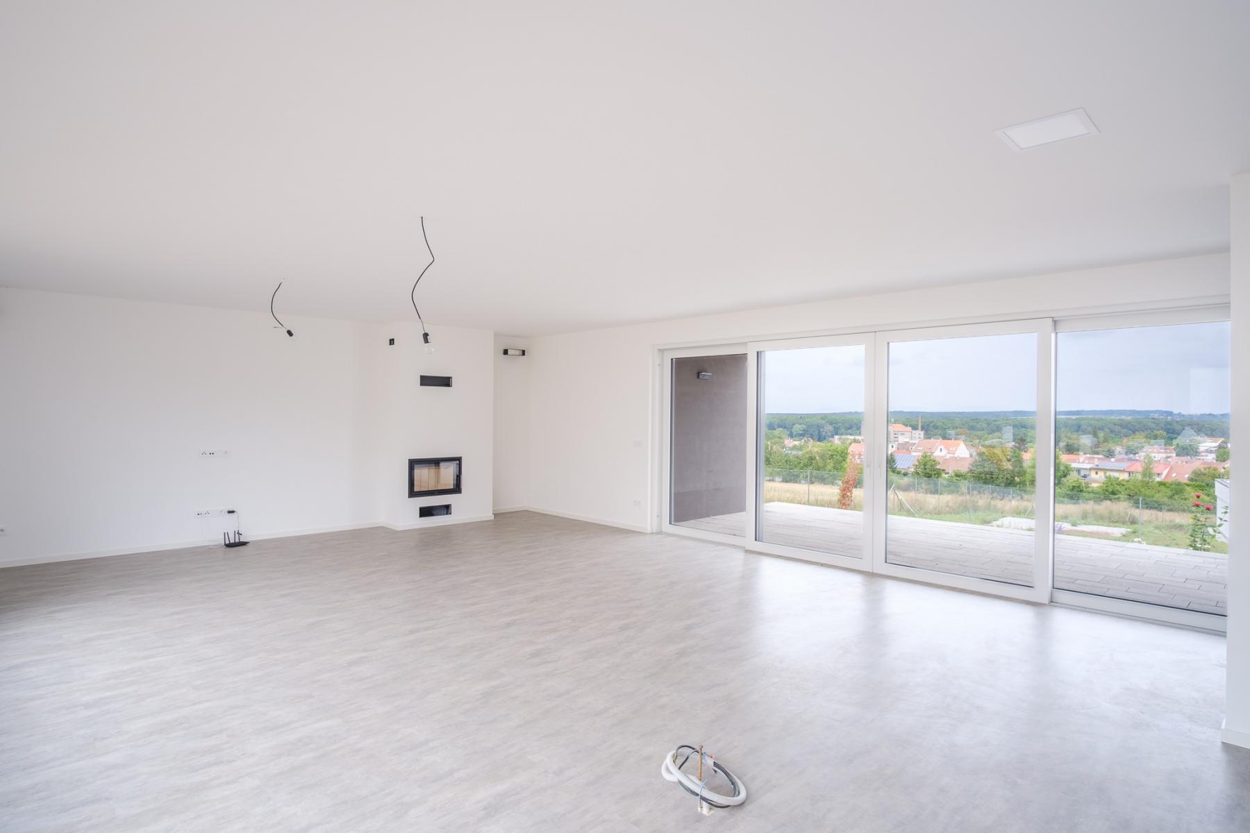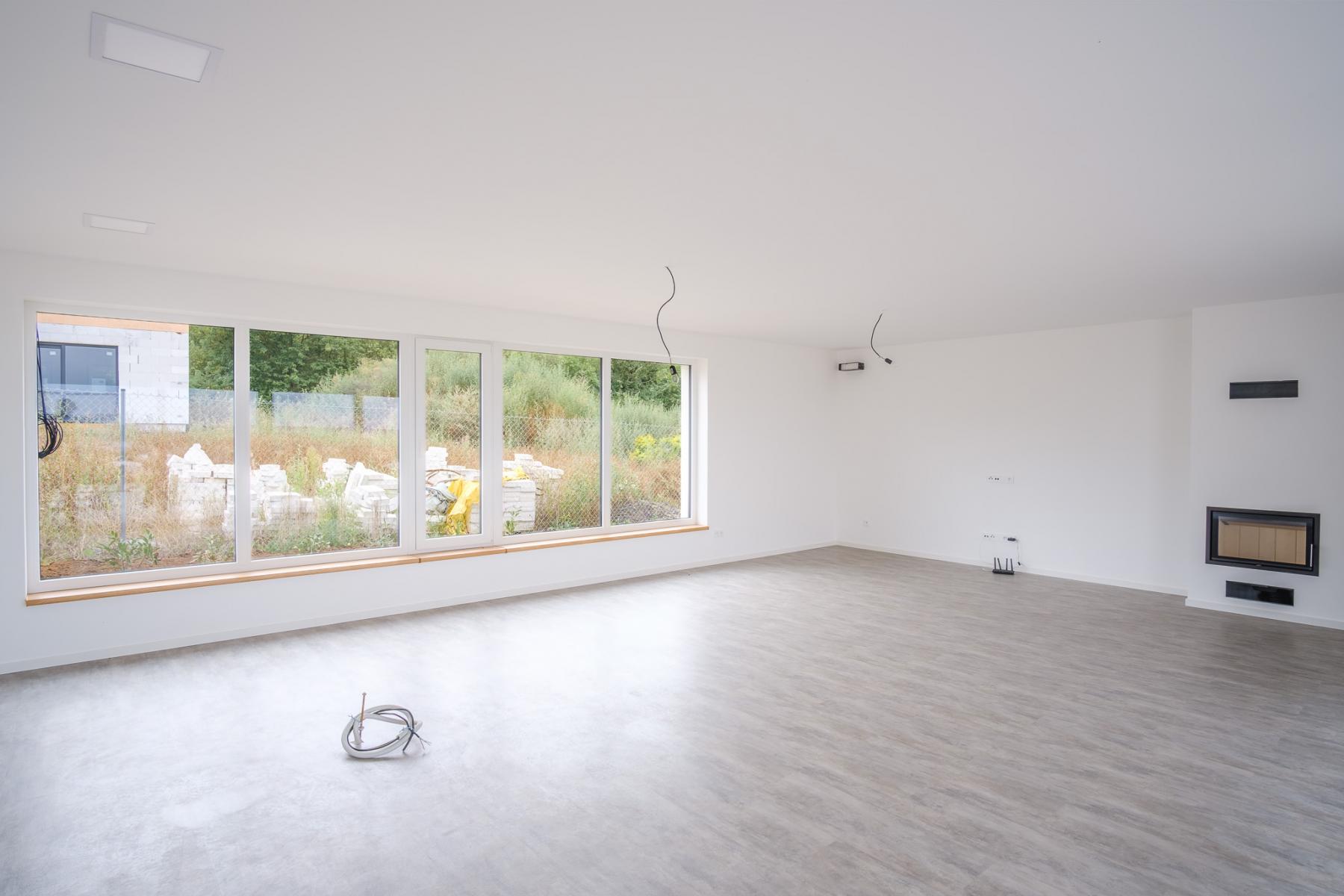 Dominantou objektu jsou velká prosklená francouzská okna s tříkomorovým systémem, skrze která se z obývacího pokoje dostanete na terasu domu s nádherným výhledem. Naproti při výhledu uvidíte zmíněný sesterský dům, který je řešený zrcadlově. Není problém tento dům kdykoliv po dohodě se sousedy navštívit pro vlastní interiérovou inspiraci.