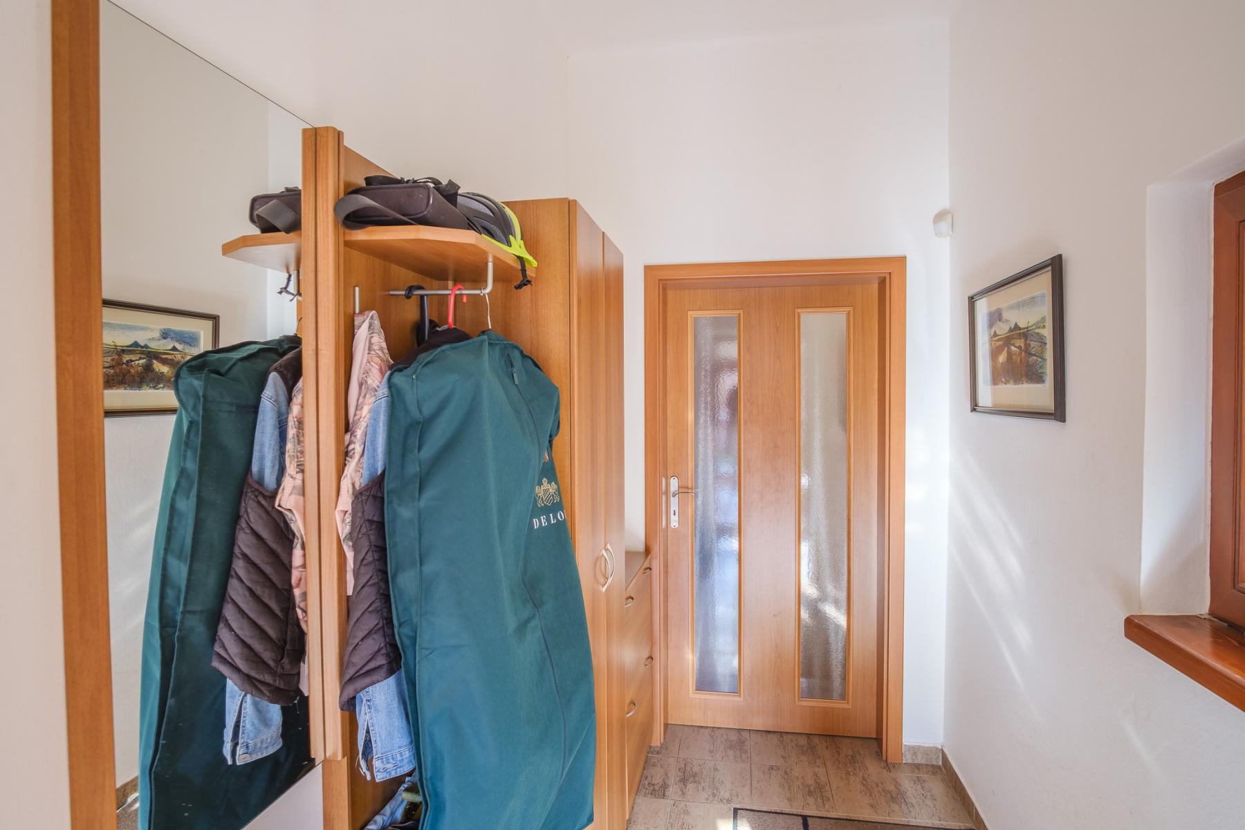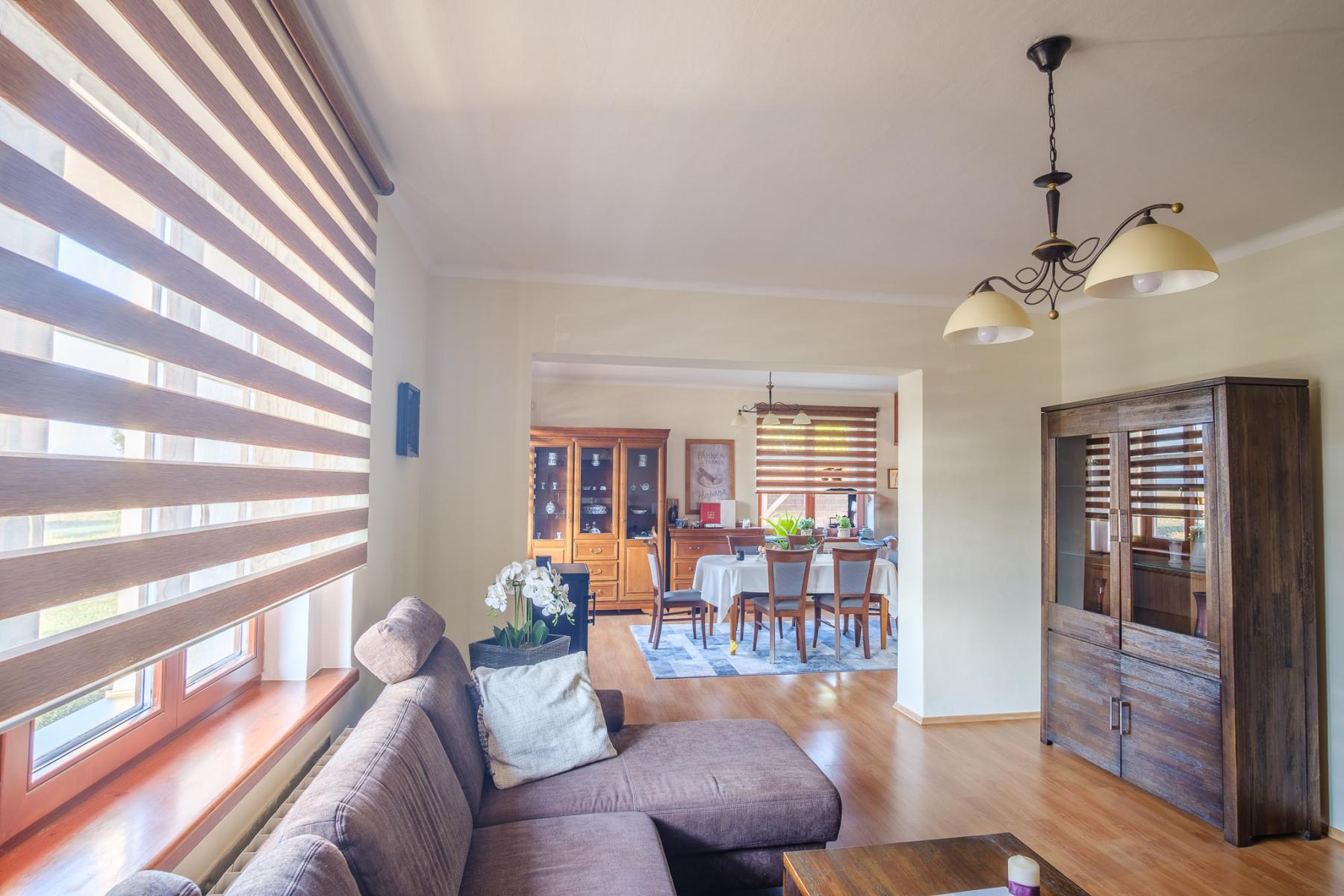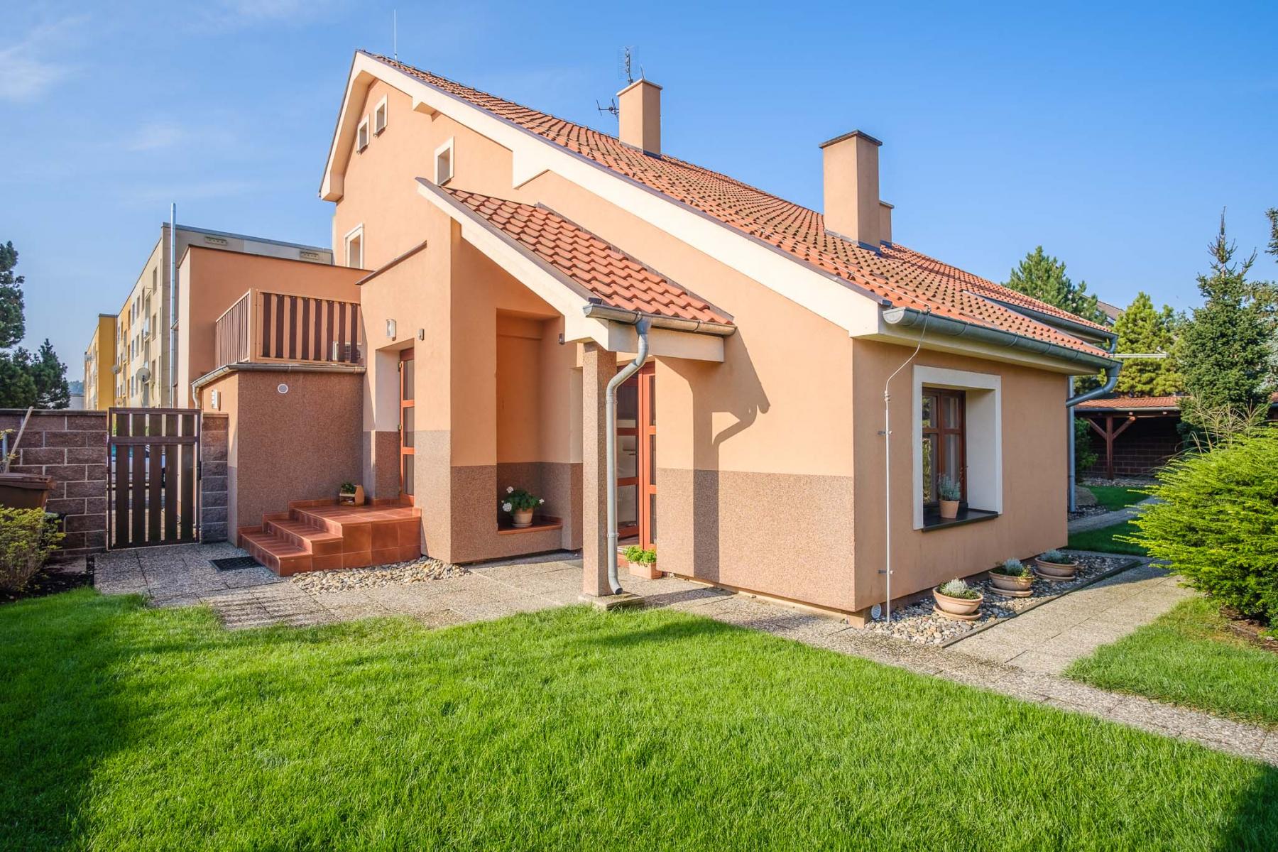 Samotný rodinný dům je dvoupatrový. V přízemí se z centrální chodby dostanete do koupelny s toaletou, kuchyně, jídelny a také do obývacího pokoje. V horním podkrovním patře rodinného domu je ložnice, dětský pokoj a pracovna s bezpečnostním trezorem. V mezipatře domu najdete vstup na venkovní terasu.