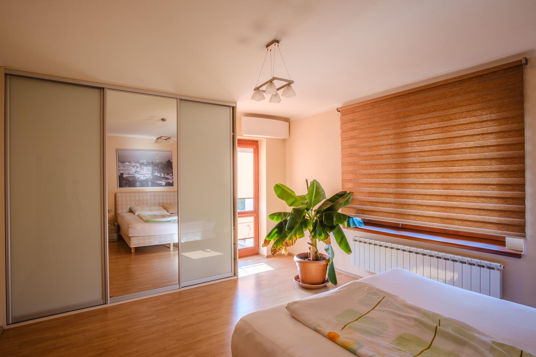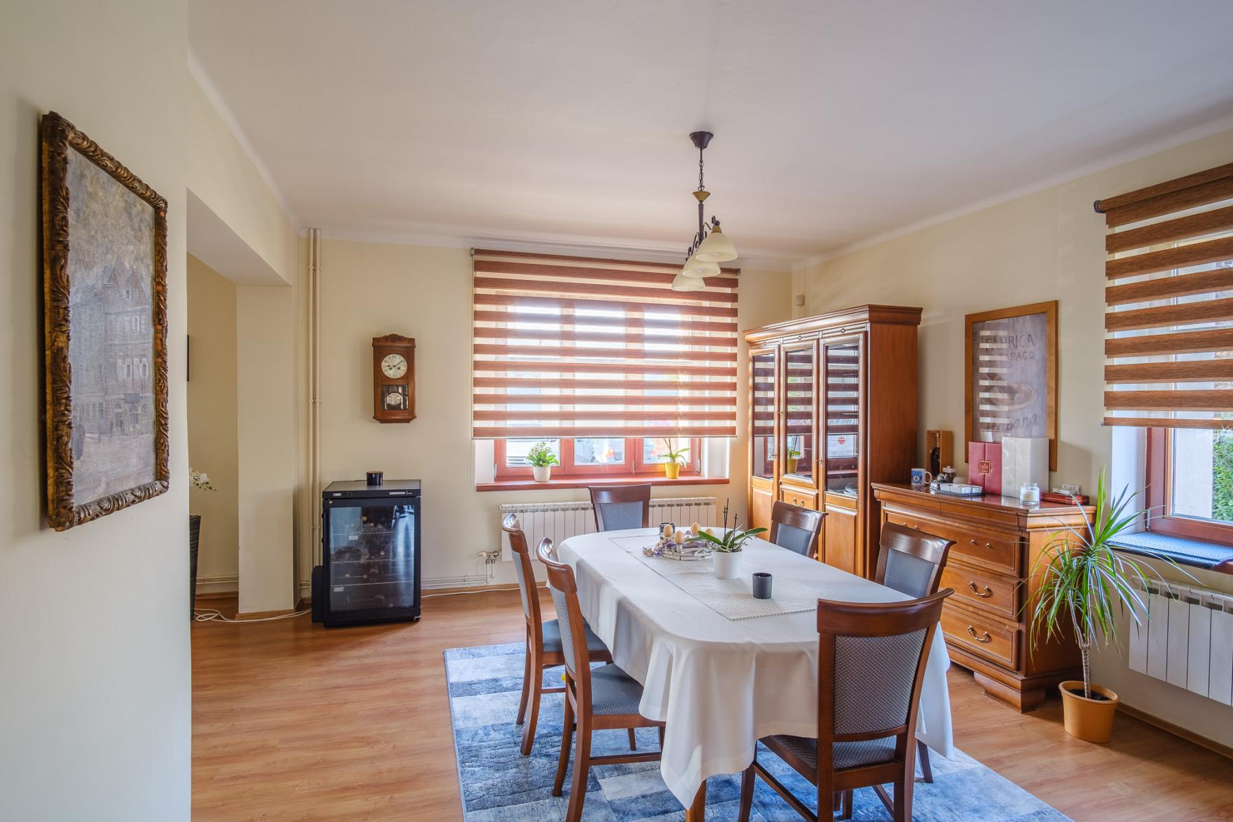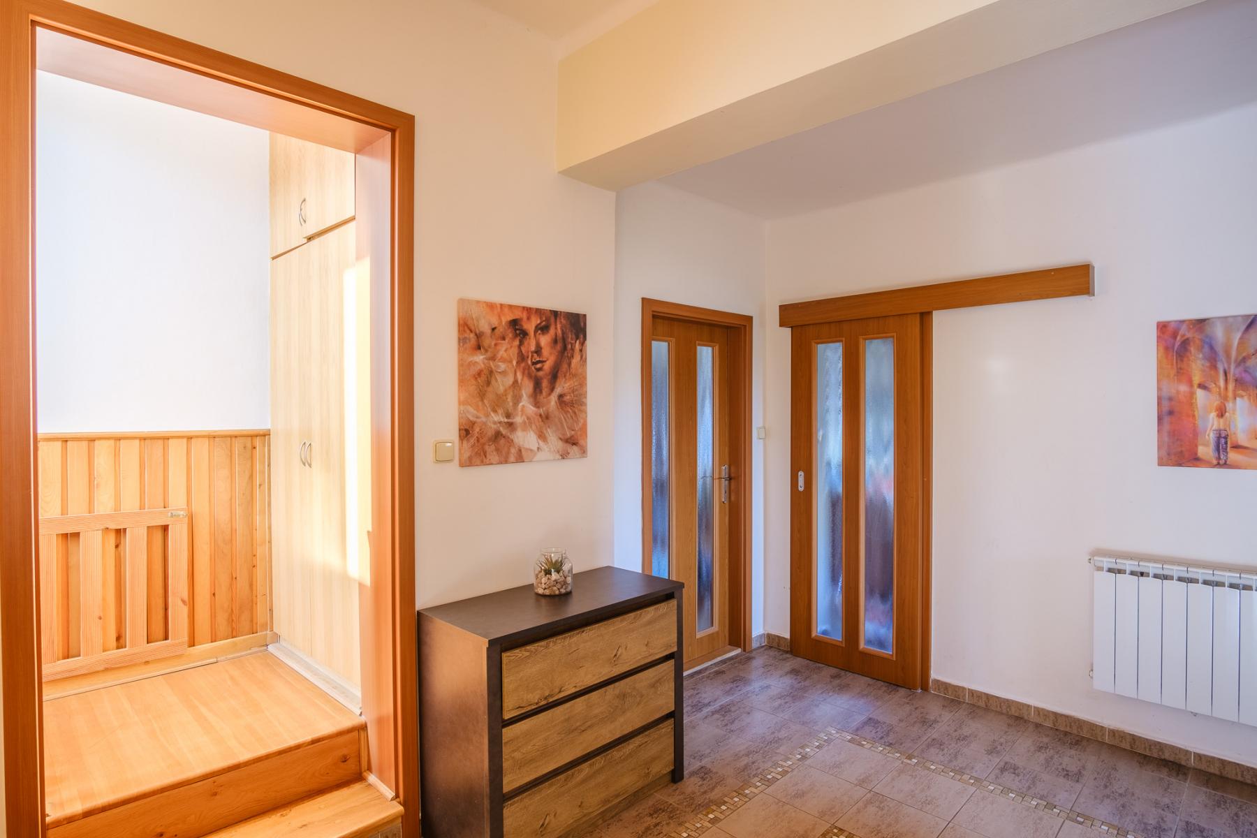 Samotný rodinný dům je dvoupatrový. V přízemí se z centrální chodby dostanete do koupelny s toaletou, kuchyně, jídelny a také do obývacího pokoje. V horním podkrovním patře rodinného domu je ložnice, dětský pokoj a pracovna s bezpečnostním trezorem. V mezipatře domu najdete vstup na venkovní terasu.