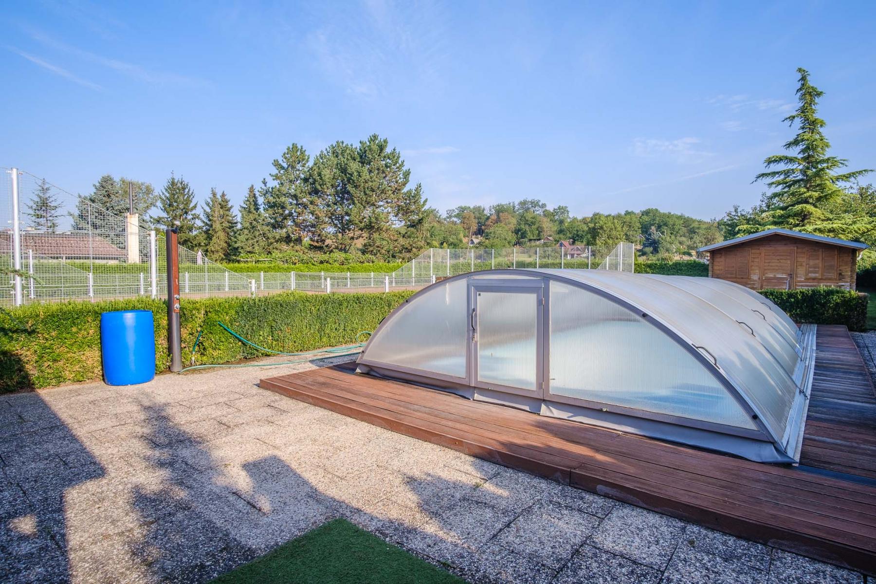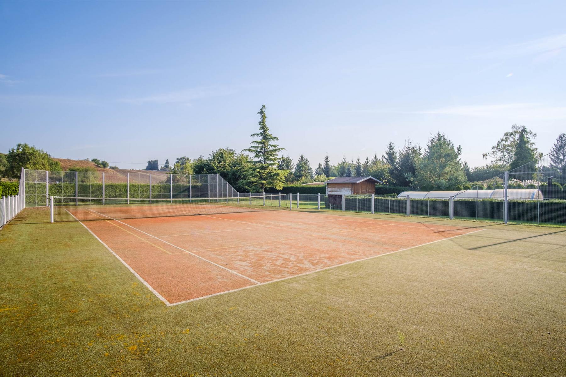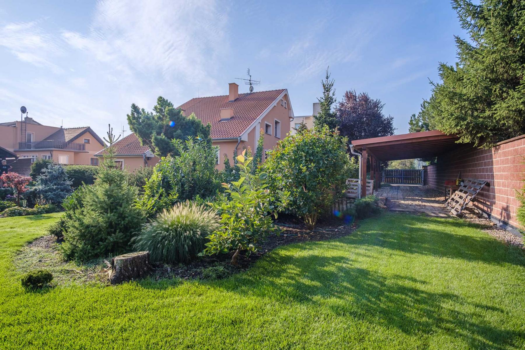 Při vstupu do objektu naleznete v přední části menší a udržovanou předzahrádku, za domem posléze velkou a prostornou zahradu, kde dominantou pozemku je soukromý tenisový kurt. Zahrada tedy disponuje prvky pro sportovní, okrasné i volnočasové vyžití. Součástí zahrady je též zastřešený bazén anebo 2 venkovní altánky. První z altánků je dřevostavba, která slouží pro uskladnění zahradní techniky. Druhý zděný altánek je řešený jako samostatná místnost s kompletním sociálním zázemím. Do budoucna lze tento altánek řešit jako objekt pro návštěvníky. Vedle rodinného domu naleznete garáž a také zastřešené parkovací stání pro celkem 3 osobní vozy.