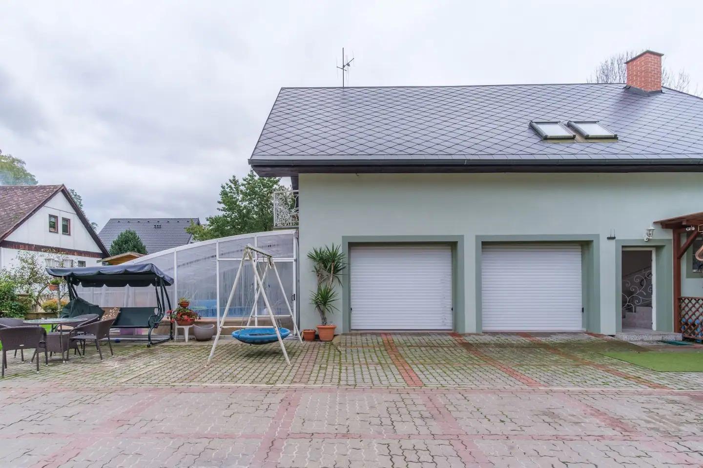 Dům disponuje menší předzahrádkou, za domem posléze naleznete opravdu prostorné nádvoří, kde lze zaparkovat několik osobních vozů. K domu navíc náleží ještě menší zadní domek, který má u sebe dvougaráž a v horním patře pak samostatnou bytovou jednotku v dispozici 2+kk o podlahové ploše cca 66 m2. Navíc je vedle tohoto menšího návštěvního domku také druhá přístavba, další garáž pro osobní vůz. Na pozemku naleznete navíc také posezení pro letní grilování, psí kotec a také zhruba 5metrový krytý bazén.